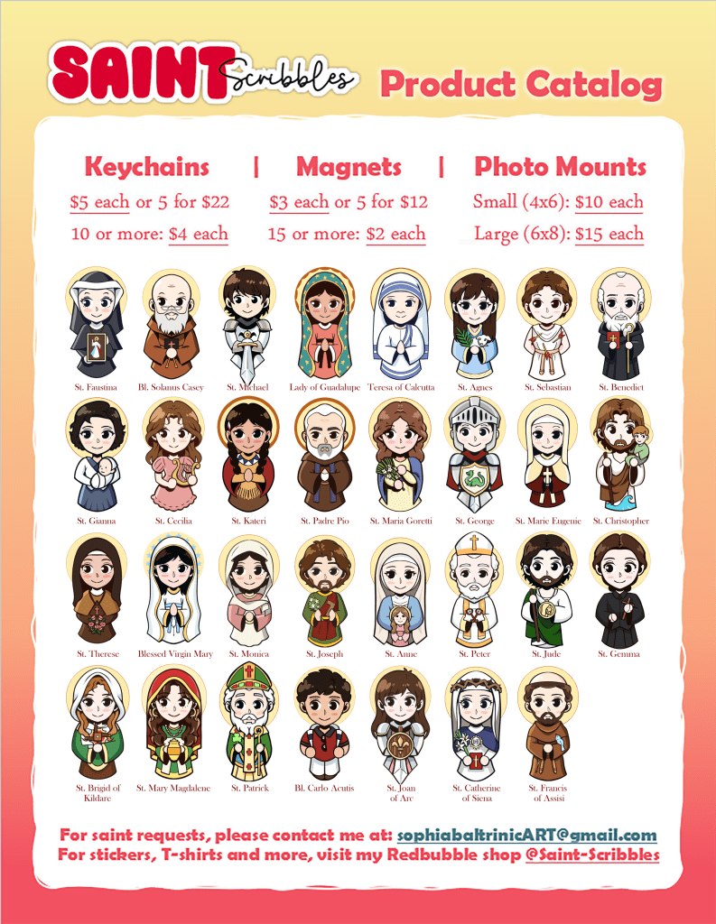 Joy-filled, faith-rooted illustrated goods from hand-drawn Catholic stickers and magnets to thoughtfully designed collections that celebrate the saints, encourage hearts, and bring beauty into everyday life art born from prayer, motherhood, and purpose.
