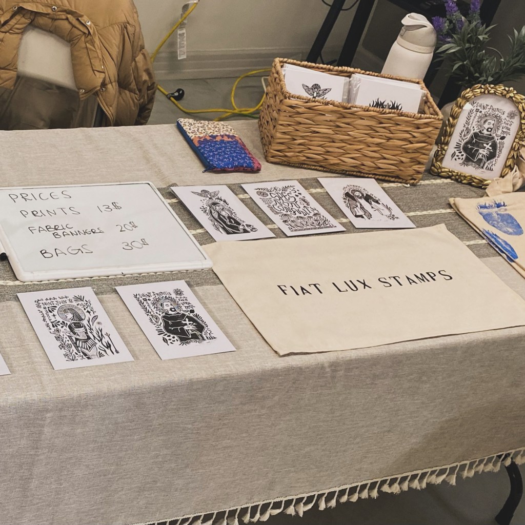 I use linocut printing to make prints, banners, bags and more! Inspired by the Creator himself, my stamps start as pure blackness at “Fiat lux” means let there be light from Genesis, because as I carve lightness enters the image.